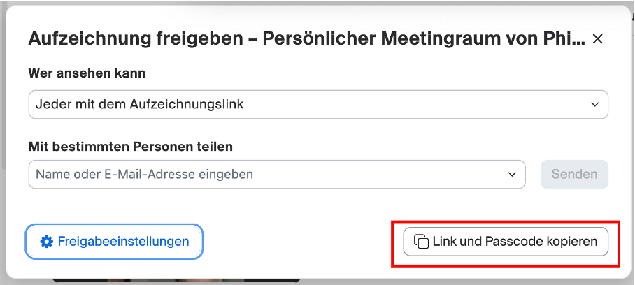 Klicke dann einfach auf Link und Passcode kopieren – siehe folgenden Screenshot: