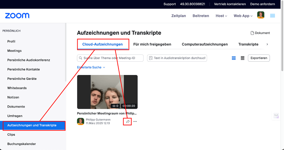Hier werden dir alle verfügbaren Zoom-Aufnahmen angezeigt.