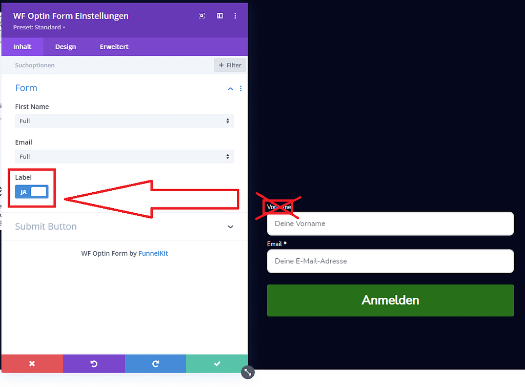 Gehe mit dem Zahnrad des Moduls in die Einstellungen und unter dem Reiter „Inhalt“ > Form > Label > dies auf Nein stellen.