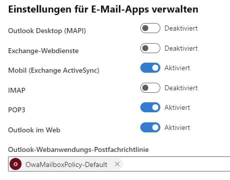 Mit der Exchange Online Kiosk Lizenz lässt sich kein IMAP aktivieren, man erhält dann eine Fehlermeldung, dass dies nicht möglich ist. Hierfür benötigt es eine „Exchange Online (Plan 1)“ Lizenz.