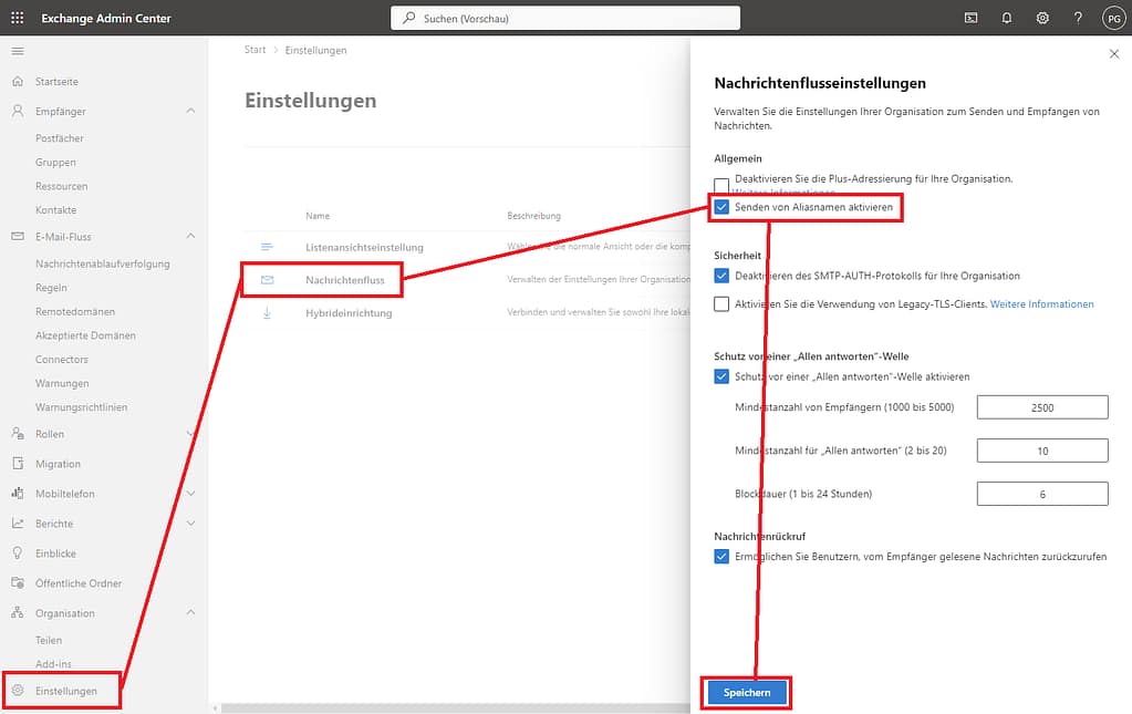 Gehe in die Einstellungen des Exchange Admin Centers.