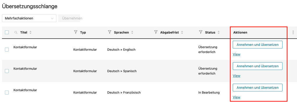 Klicke unter Aktionen auf die Buttons (hier: Annehmen und übersetzen, sie können aber auch Bearbeiten oder anders lauten) um das Kontaktformular für die entsprechenden Sprachen zu übersetzen.
