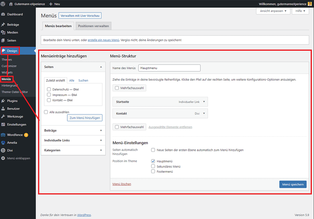 Das Menü findet man unter dem Hauptmenüpunkt Design: